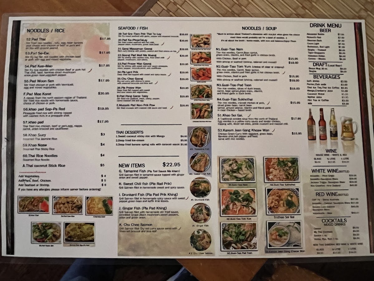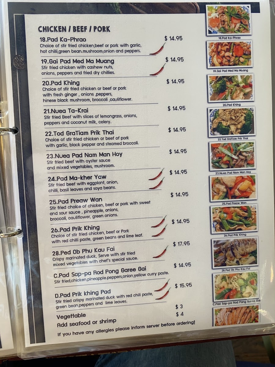 One must-try dish is the Pad SeEw, a savory stir fry made with big flat rice noodles, tender chicken, beef, or pork, mixed with egg and fresh vegetables. If you're in the mood for something a bit different, the Pad Mee Korat is a classic from northeastern Thailand, featuring fried rice noodles in a homemade sauce with your choice of chicken or pork.